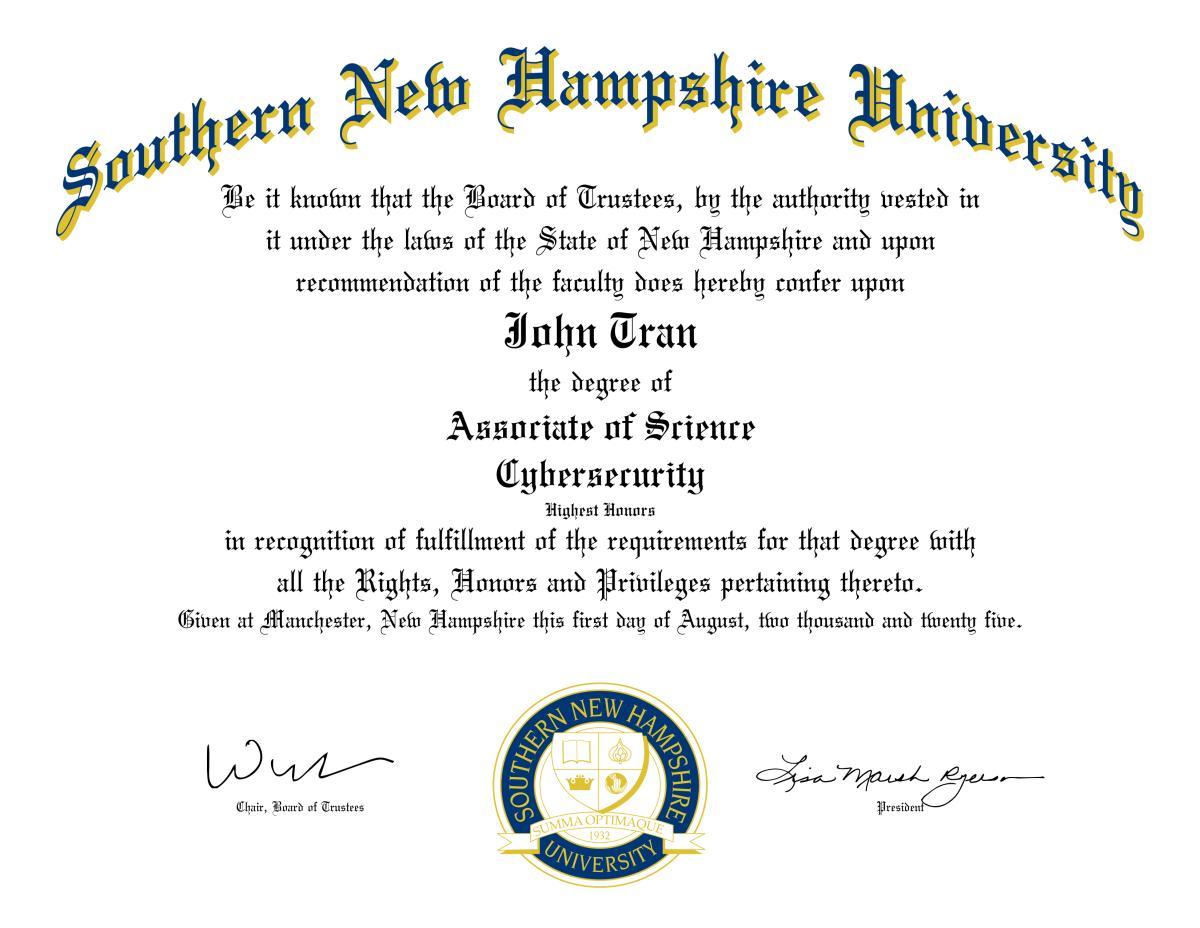 January, 06 2026 - Verified by Southern New Hampshire UniversityCongratulations on being named to Southern New Hampshire University's Honor Roll for the 2025 C-5 (Sep - Oct) term! Honor Roll is a term-specific achievement that recognizes learners who excel at ...