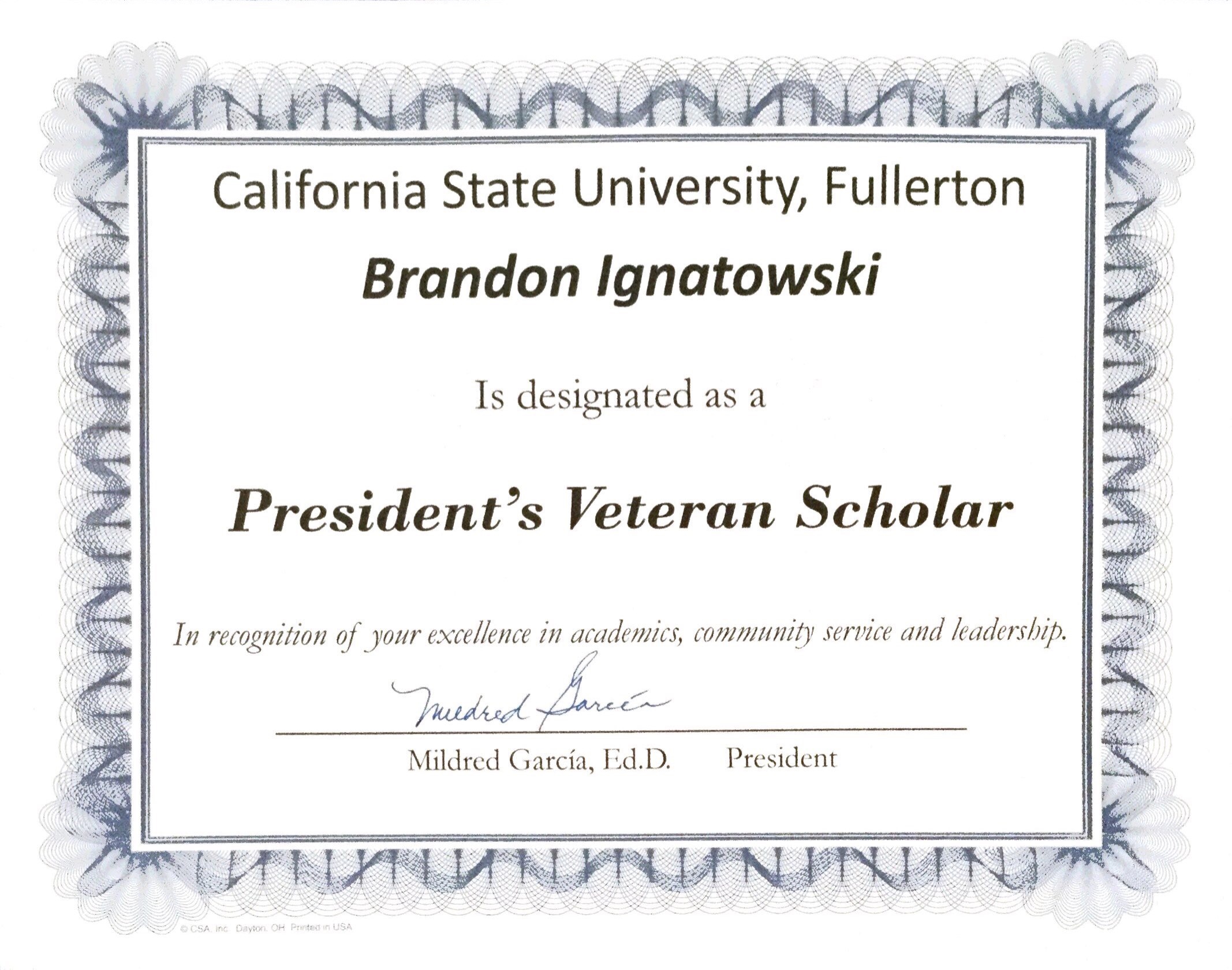 Presidents Veteran Scholar, full-ride Academic Scholarship.