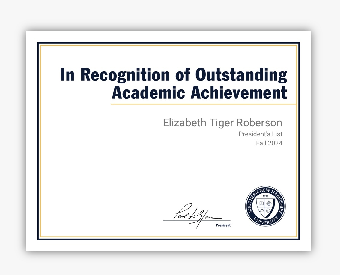 November, 04 2025 - Verified by Southern New Hampshire UniversityCongratulations on being named to Southern New Hampshire University's Honor Roll for the 2025 C-4 (Jun - Aug) term! Honor Roll is a term-specific achievement that recognizes learners who excel at ...