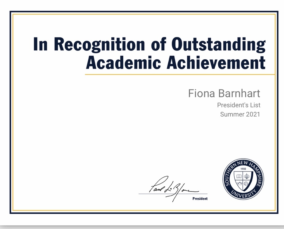 January, 13 2022 - Verified by Southern New Hampshire UniversityFiona Barnhart has been named to Southern New Hampshire University's summer 2021 President's List. Eligibility for the President's List requires that a student accumulate an academic grade point av...