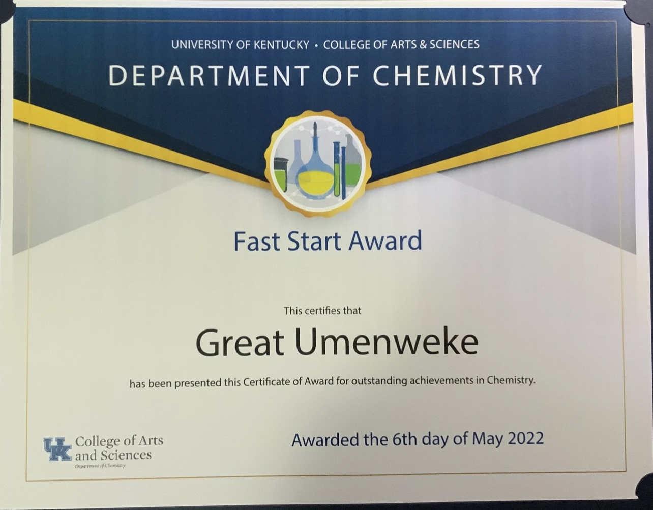 Fast Start Award - Presented to a graduate student in his or her first or second year in the Department of Chemistry, who has made outstanding initial overall progress towards his or her degree. Factors to be considered are performance in courses, initiative in research, and success in cumulative exams (2022)