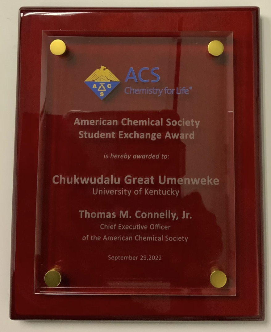 American Chemical Society (ACS) Student Exchange Award - in recognition for a combination of achievements, including the NOBCChE abstract submission, peer-reviewed publication record, and campus/community involvement. (2022)