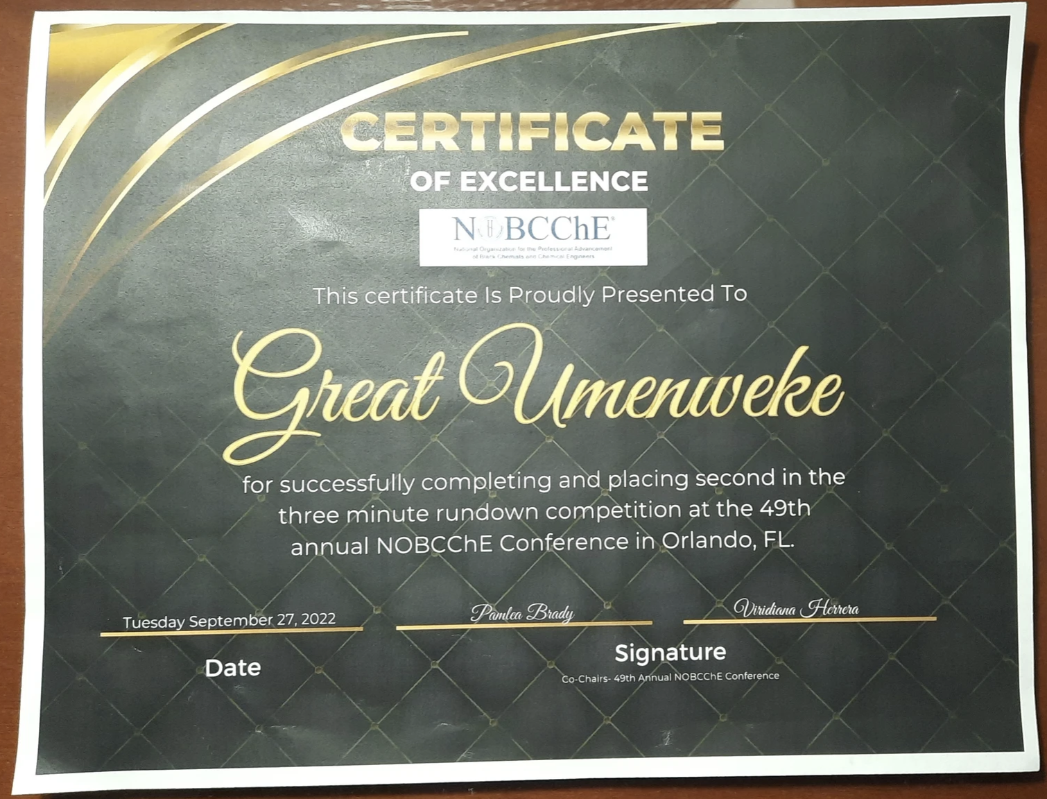 2nd Place Award Three Minute Rundown; Research Thesis Oral Presentation at the National Organization for the Professional Advancement of Black Chemists and Chemical Engineers National (NOBCCHE) 49th Meeting (2022)