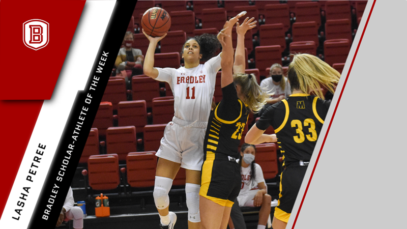 January, 28 2021 - Bradley UniversityJunior Lasha Petree (Detroit, Mich./Arbor Prep) has been named this week's Bradley Scholar-Athlete of the Week announced Wednesday, Dec. 16 after helping Bradley Women's Basketball rally from behin...
