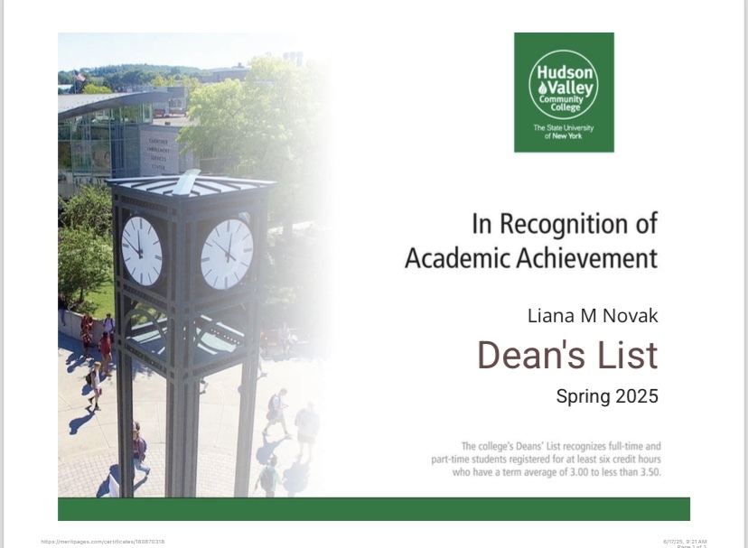 January, 29 2026 - Verified by Hudson Valley Community CollegeLiana Novak of Watervliet was named to the Spring 2025 Dean's List at Hudson Valley Community College. Novak is studying in the Individual Studies academic program at the Troy, NY college. The D...
