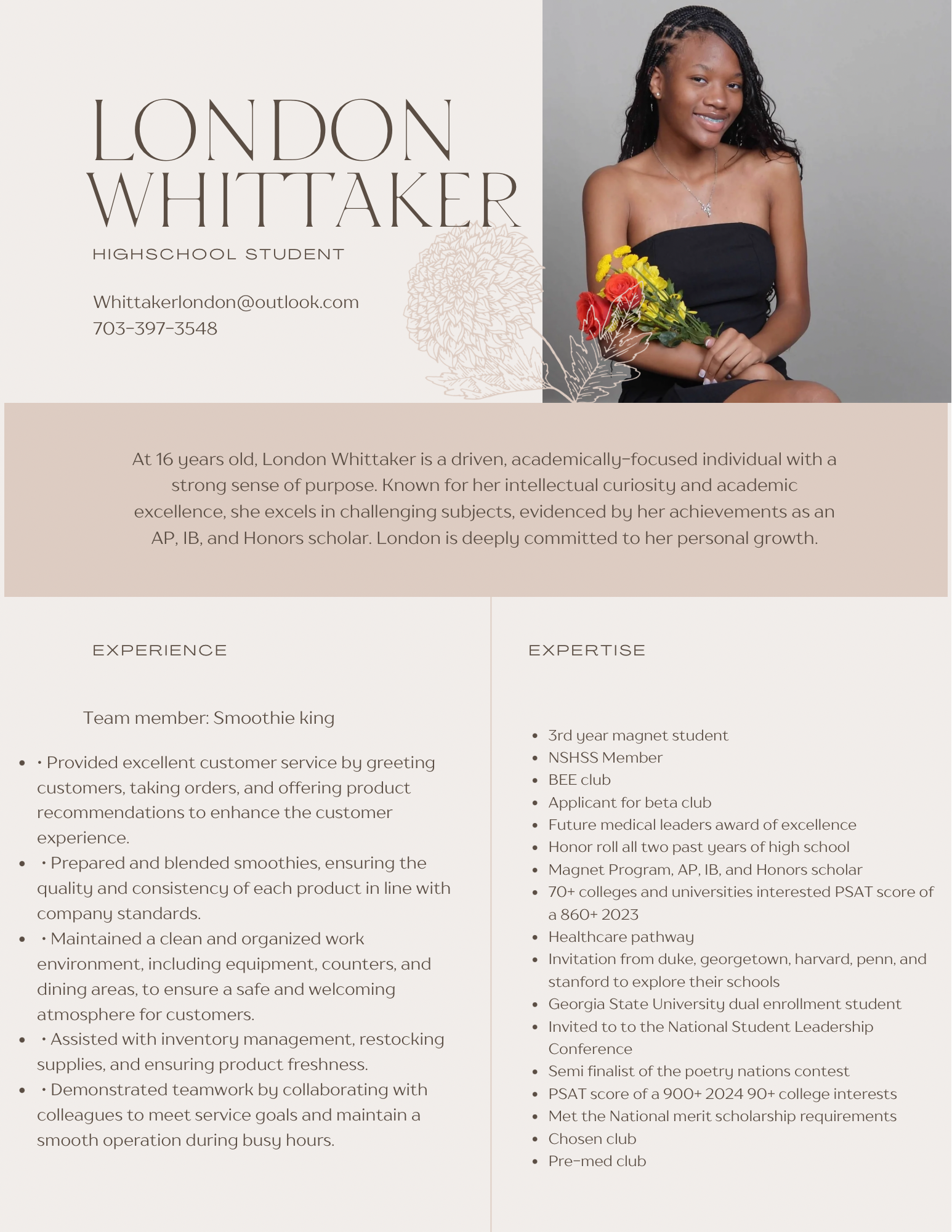 My name is London, and Im a junior at Westlake High School as well as a dual enrollment student here at GSU. Im committed to academic excellence and strive to make the most of my learning opportunities. Im passionate about healthcare literacy and engage in both coursework and community initiatives to improve understanding of important health topics. I enjoy collaborating with others and am dedicated to making meaningful contributions both academically and socially.