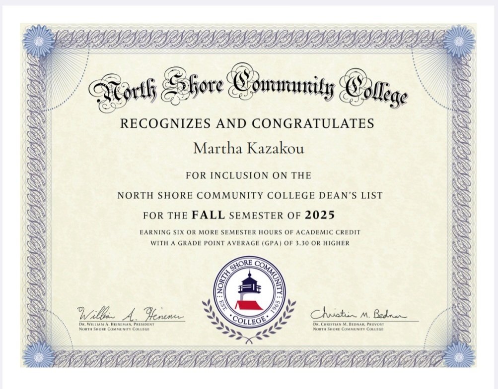 Martha Kazakou Named to Fall 2025 Dean's List at North Shore Community College