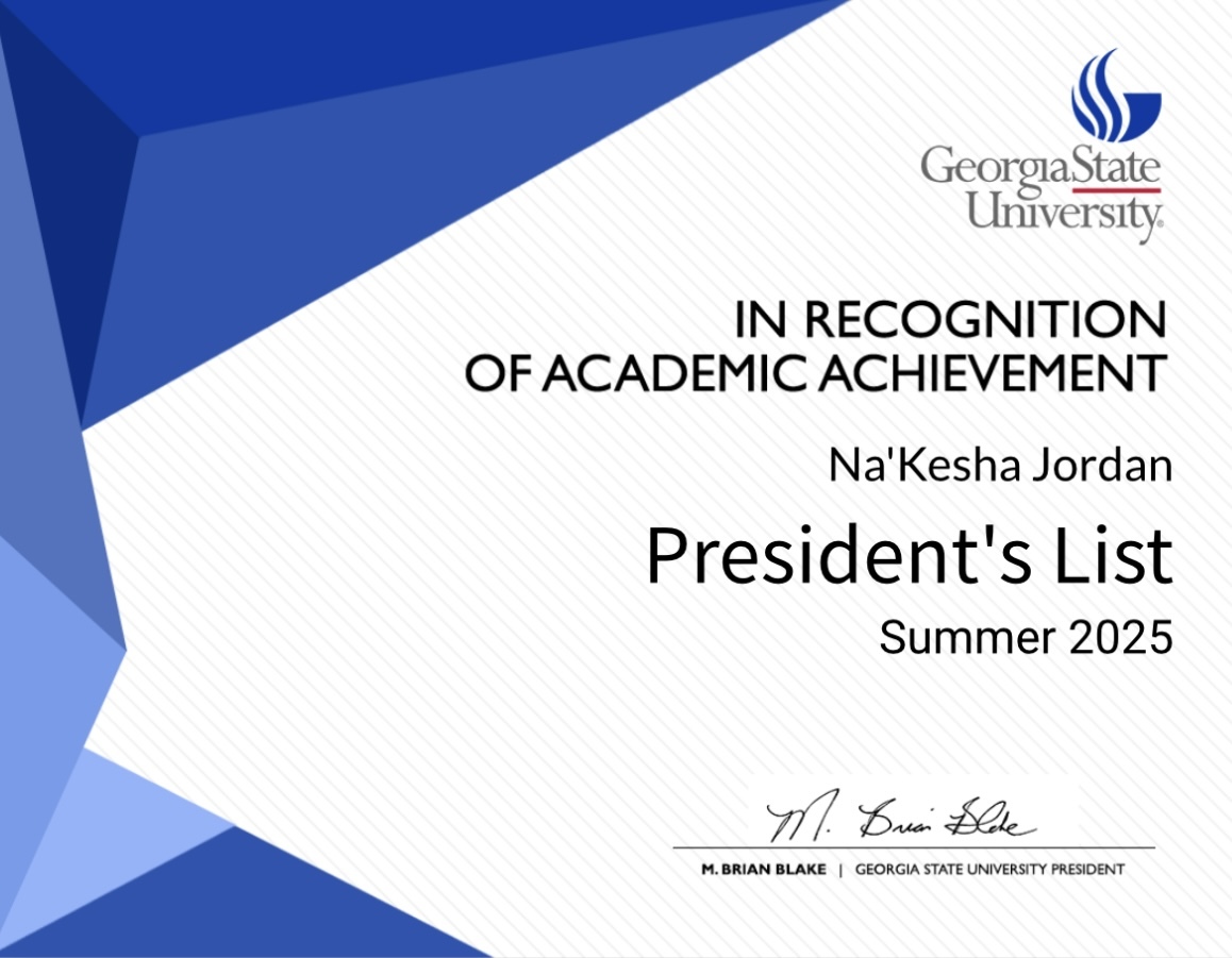 February, 03 2026 - Verified by Georgia State UniversityNa'Kesha Jordan, of Atlanta (30314), was named to the Summer 2025 President's List at Georgia State University. To be eligible for the President's List during the summer semester, degree-seeking s...