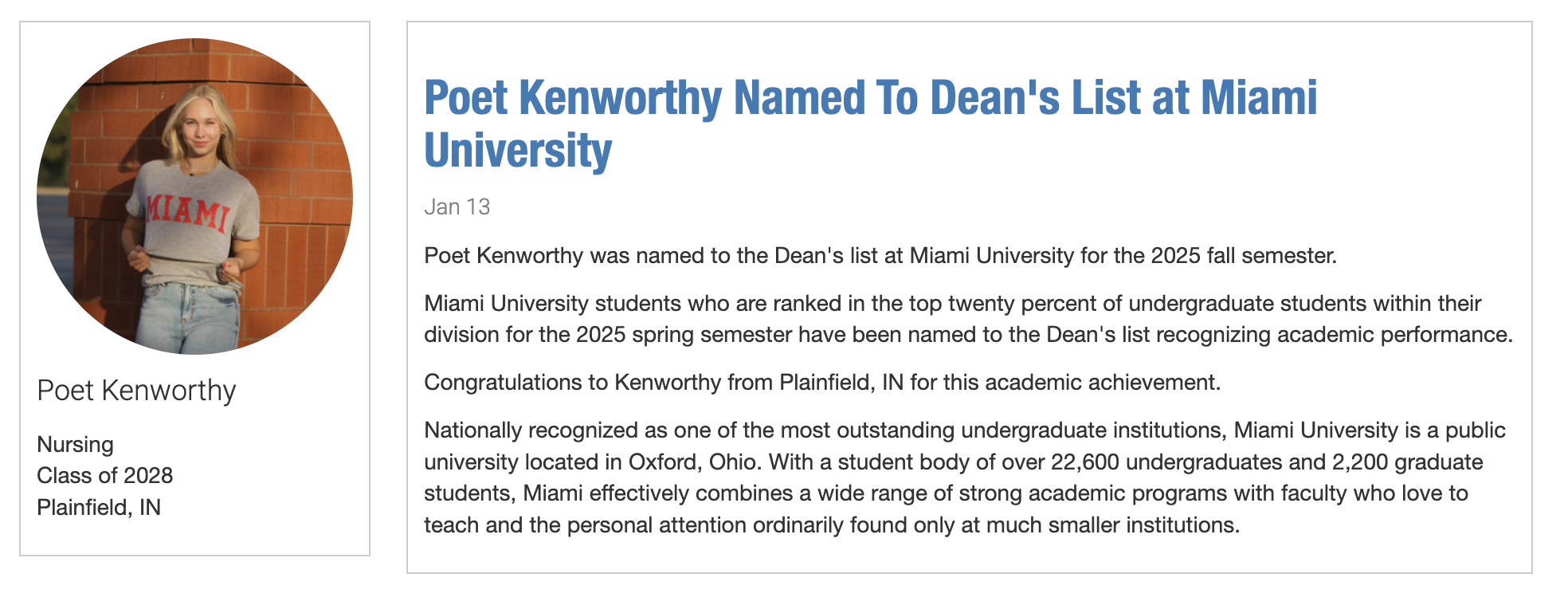 Poet Kenworthy was named to the Dean's list at Miami University for the 2025 fall semester. Miami University students who are ranked in the top twenty percent of undergraduate students within thei...