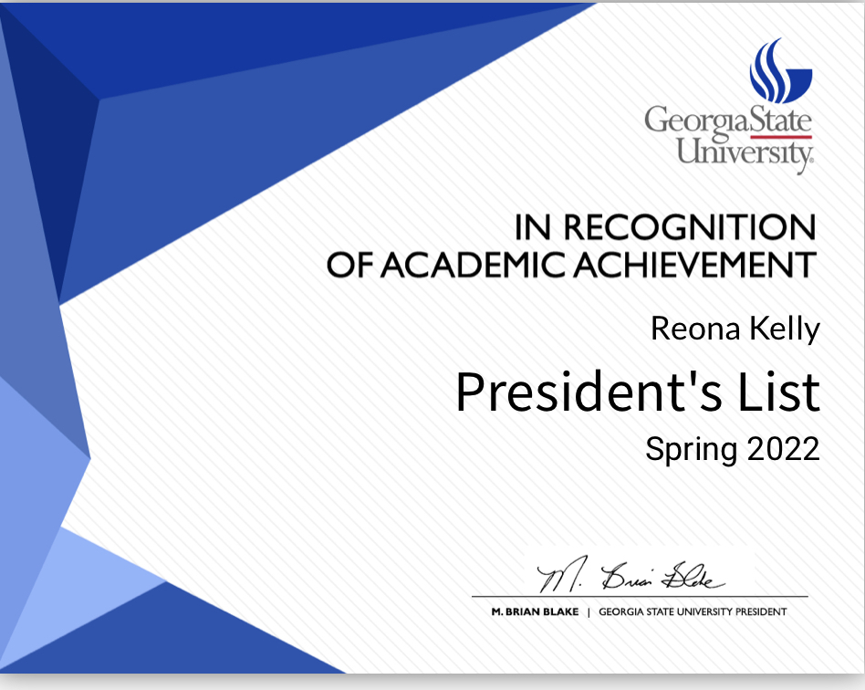 February, 05 2025 - Verified by Georgia State UniversityReona Kelly of Strathbogie District was named to the Spring 2024 President's List at Georgia State University. To be eligible for the President's List, degree-seeking students must have earned a G...