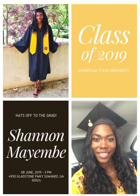 July, 16 2019 - Verified by Kennesaw State UniversityKennesaw State University recently welcomed its newest class of graduates. Shannon Mayembe of Suwanee graduated. Over 3,000 students earned bachelor's, master's or doctoral degrees during the Spr...