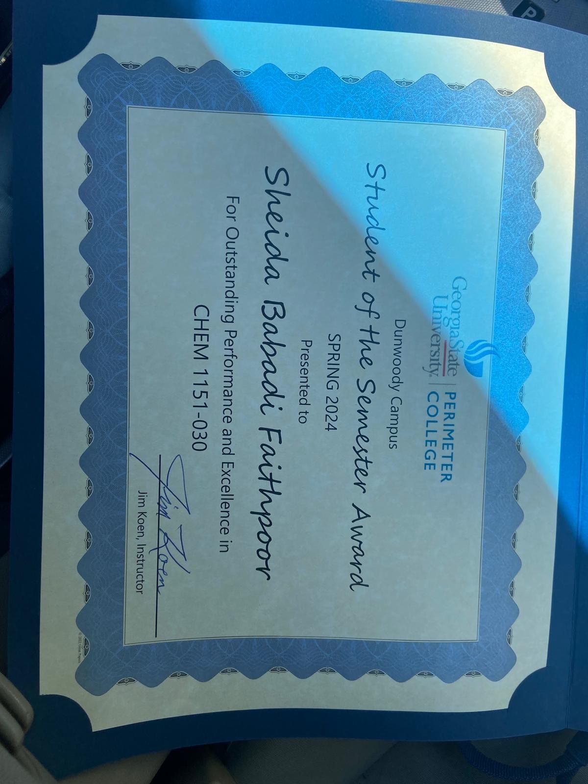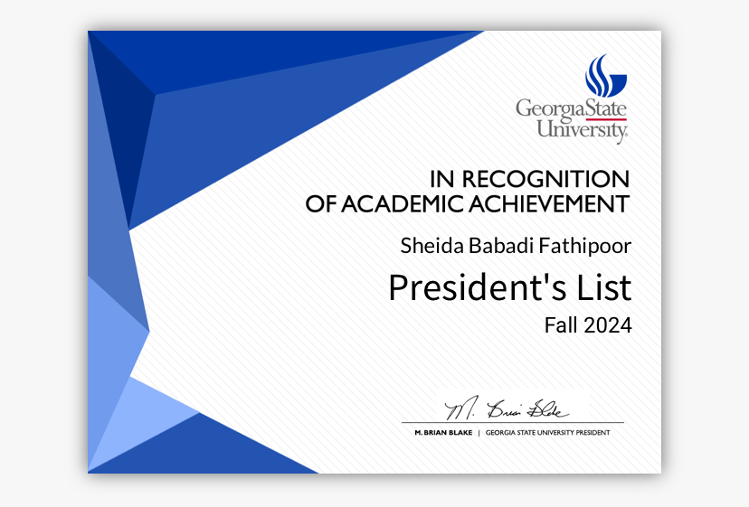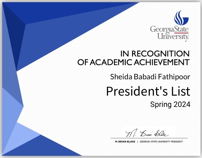 February, 05 2025 - Verified by Georgia State UniversitySheida Babadi Fathipoor of Smyrna was named to the Summer 2024 President's List at Georgia State University. To be eligible for the President's List during the summer semester, degree-seeking stud...