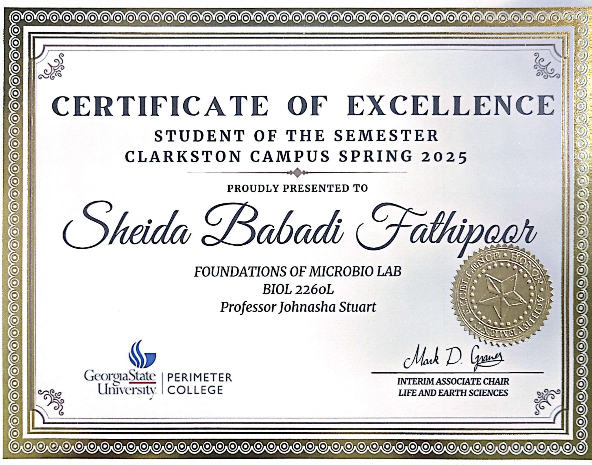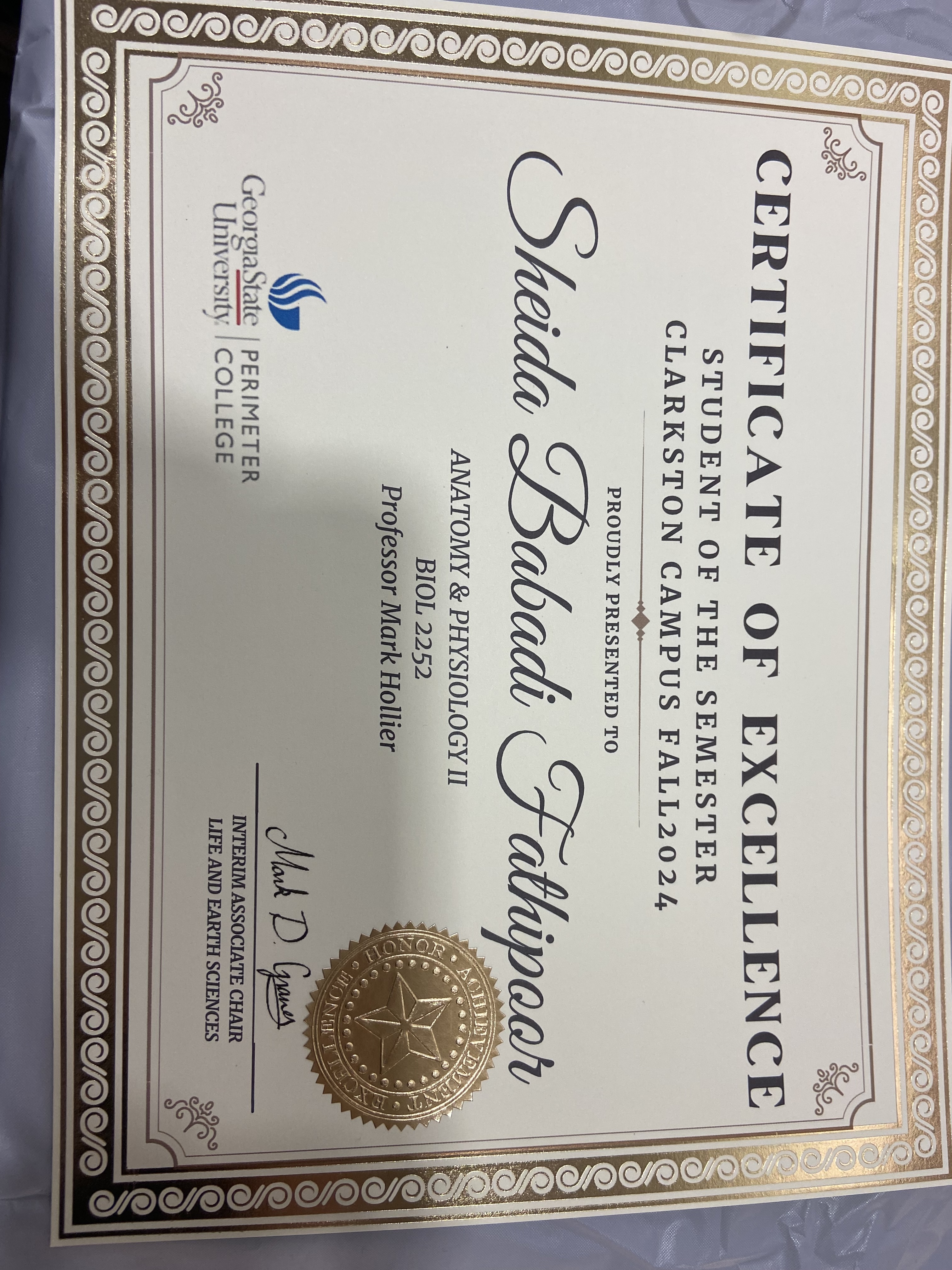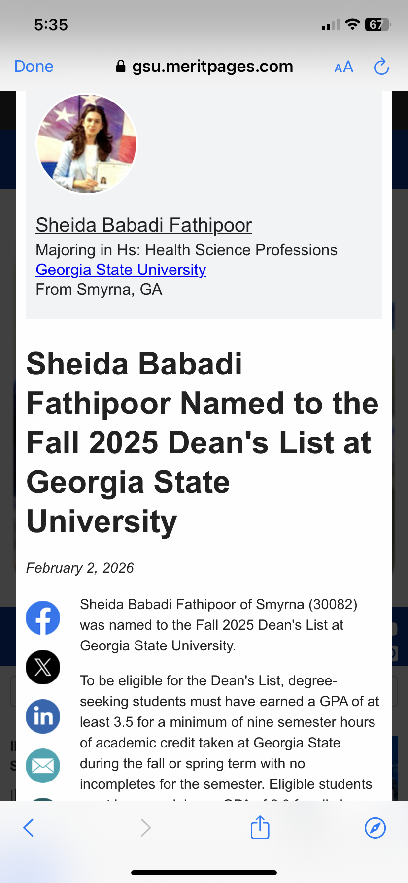 February, 04 2026 - Verified by Georgia State UniversitySheida Babadi Fathipoor of Smyrna was named to the fall 2024 President's List at Georgia State University. To be eligible for the President's List, degree-seeking students must have earned a GPA o...