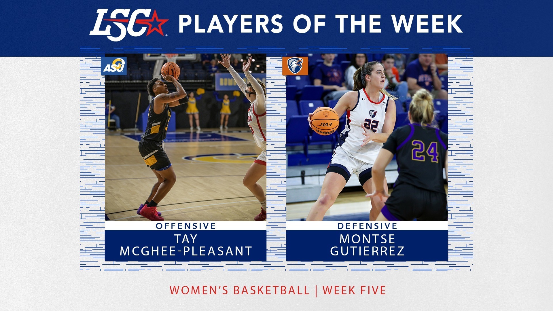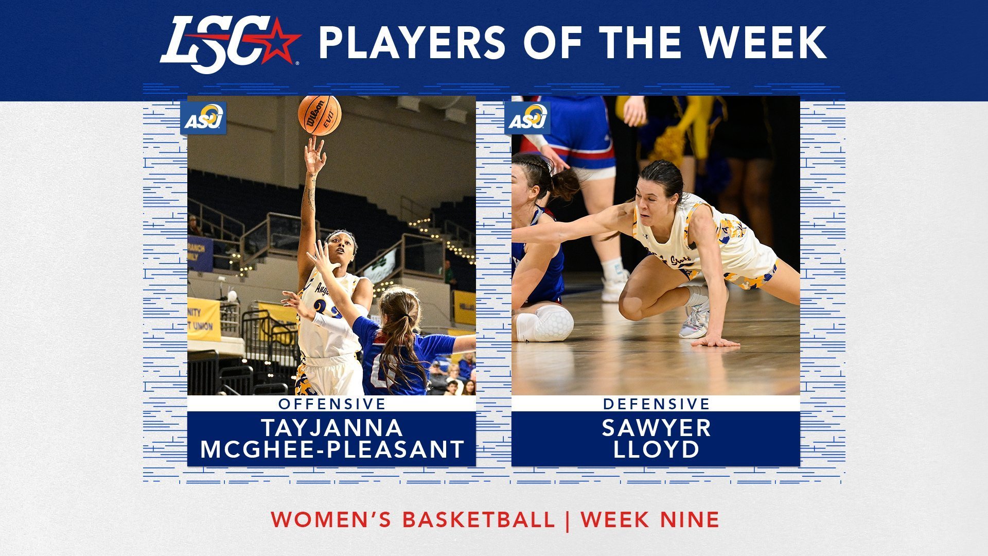 February, 27 2023 - Verified by Angelo State UniversityTayjanna McGhee-Pleasant of Amarillo and Sawyer Lloyd of Wall, both juniors on the Angelo State University Belles basketball team, have been named the Lone Star Conference Women's Basketball Player...