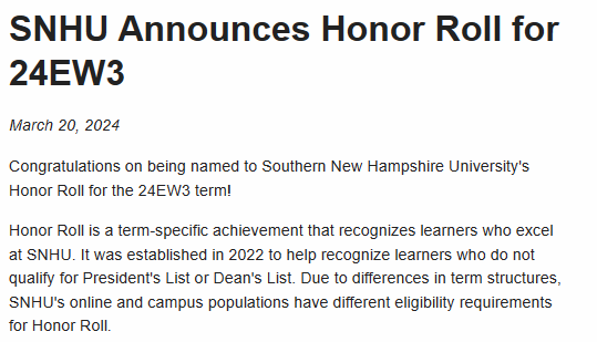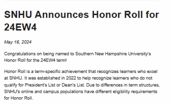 May, 16 2024 - Verified by Southern New Hampshire UniversityCongratulations on being named to Southern New Hampshire University's Honor Roll for the 24EW4 term! Honor Roll is a term-specific achievement that recognizes learners who excel at SNHU. It was es...