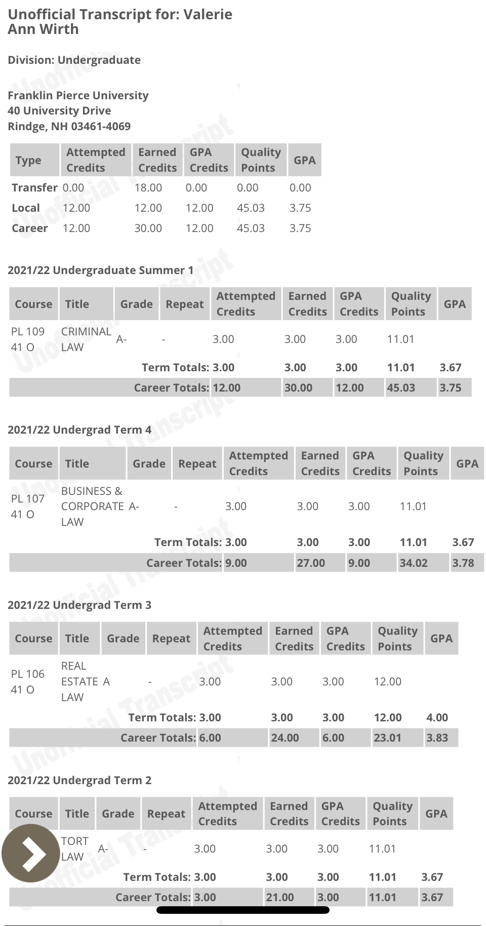 July, 06 2022 - Verified by Southern New Hampshire UniversityValerie Wirth has been named to Southern New Hampshire University's Winter 2022 President's List. Full-time undergraduate students who have earned a minimum grade-point average of 3.700 and above ...