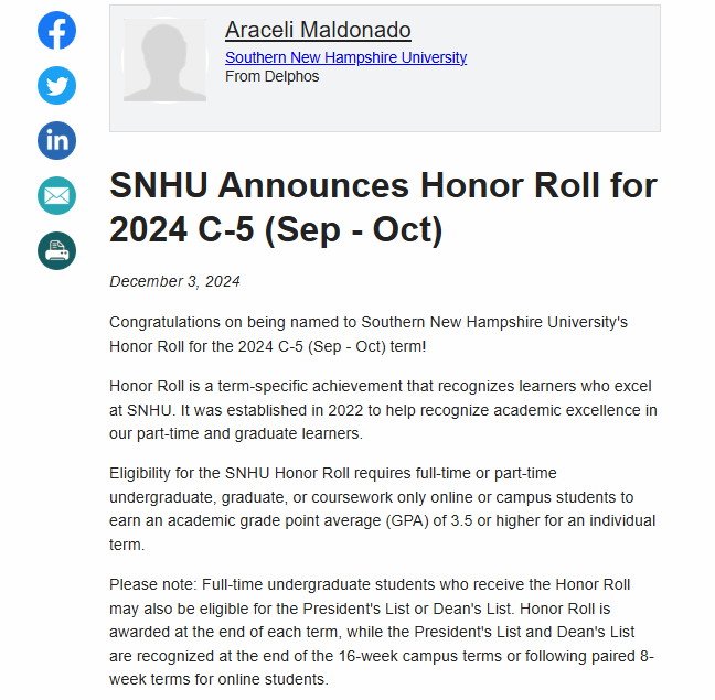 January, 14 2025 - Verified by Southern New Hampshire UniversityCongratulations on being named to Southern New Hampshire University's Honor Roll for the 2024 C-5 (Sep - Oct) term! Honor Roll is a term-specific achievement that recognizes learners who excel at ...