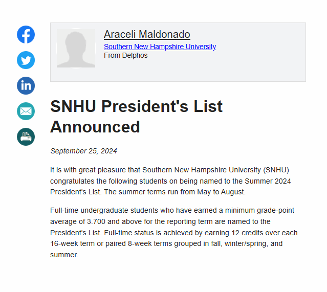 December, 03 2024 - Verified by Southern New Hampshire UniversityIt is with great pleasure that Southern New Hampshire University (SNHU) congratulates the following students on being named to the Summer 2024 President's List. The summer terms run from May to Aug...