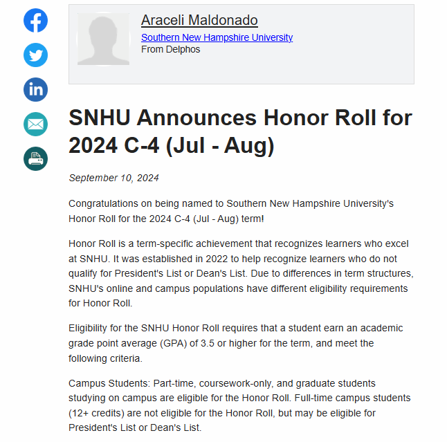 September, 10 2024 - Verified by Southern New Hampshire UniversityCongratulations on being named to Southern New Hampshire University's Honor Roll for the 2024 C-3 (May-Jun) term! Honor Roll is a term-specific achievement that recognizes learners who excel at SN...
