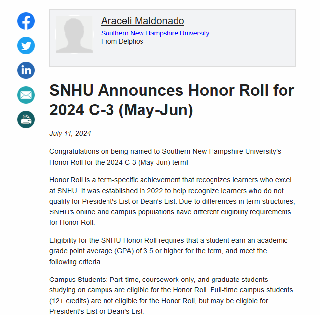 Congratulations on being named to Southern New Hampshire University's Honor Roll for the 2026 C-1 (Jan - Mar) term! Honor Roll is a term-specific achievement that recognizes learners who excel at ...