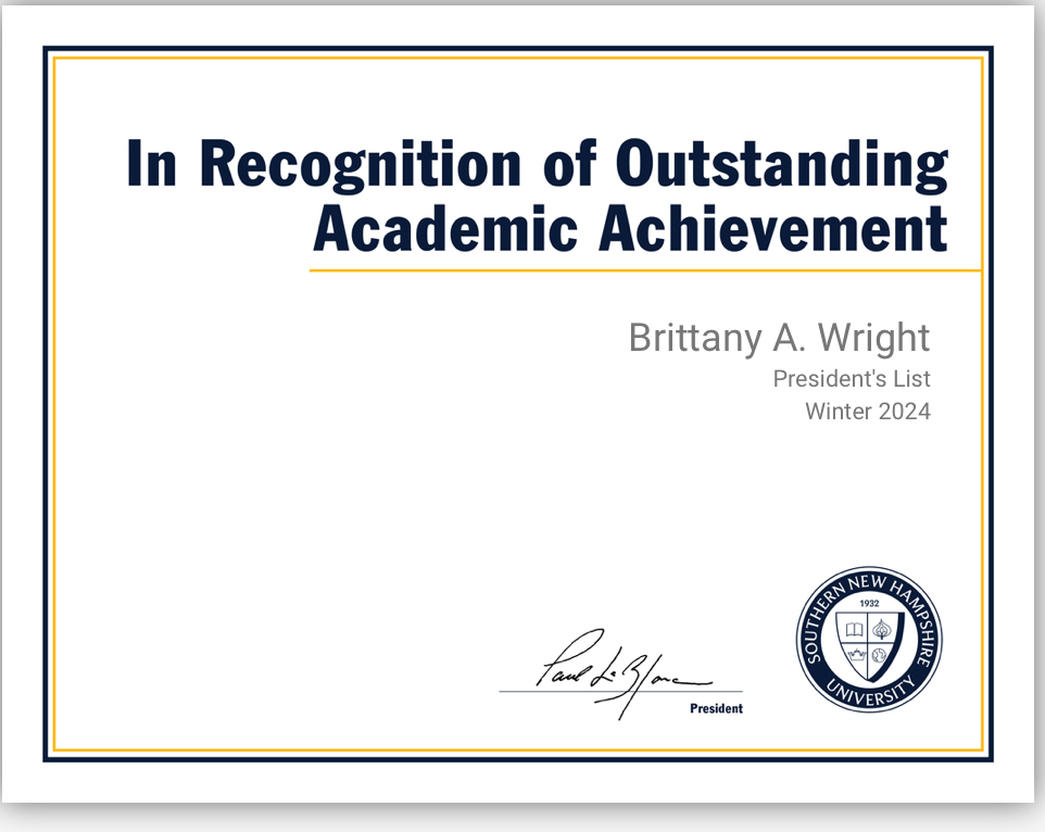 May, 16 2024 - Verified by Southern New Hampshire UniversityCongratulations on being named to Southern New Hampshire University's Honor Roll for the 24EW4 term! Honor Roll is a term-specific achievement that recognizes learners who excel at SNHU. It was es...