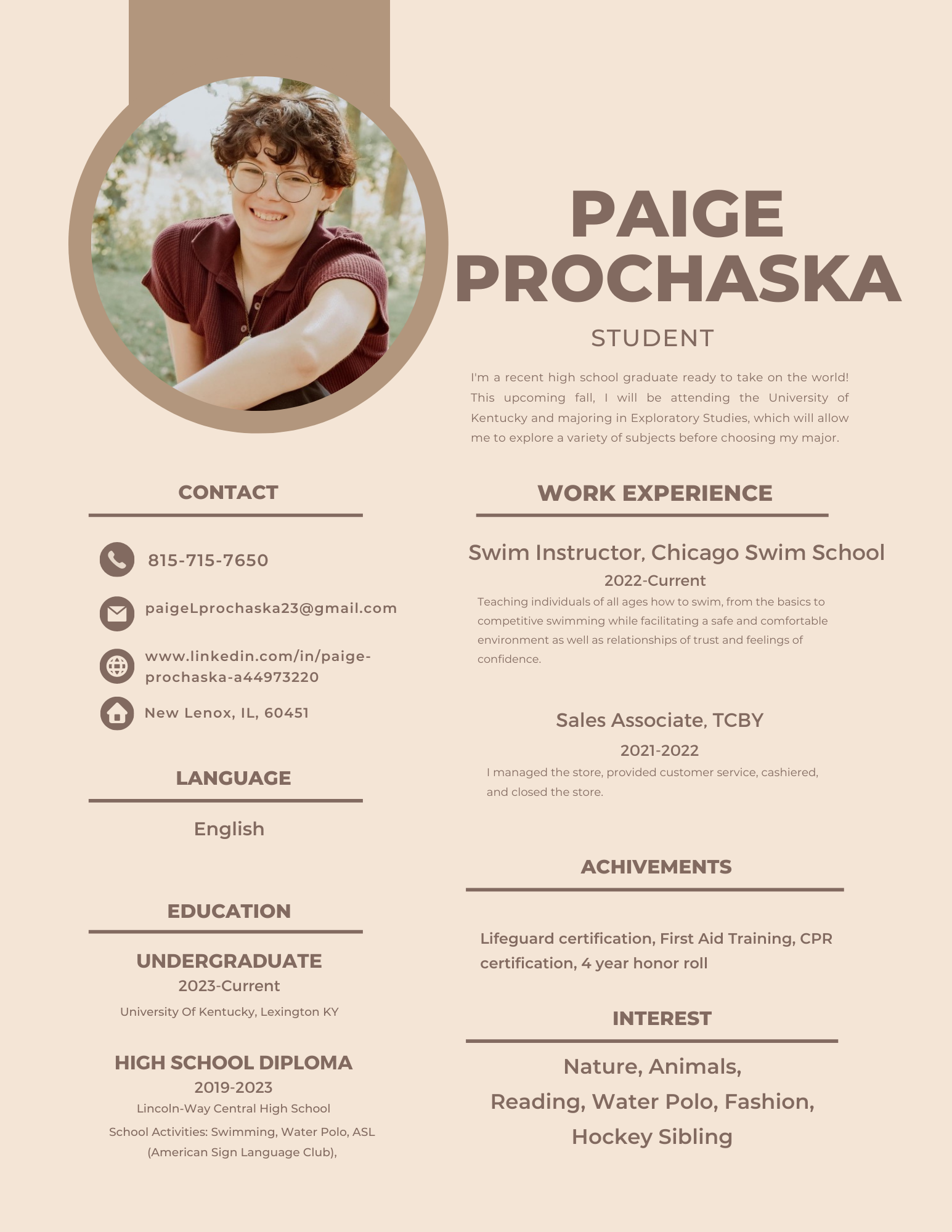 August, 15 2023 - University of Kentucky College of Arts and SciencesI teach people of all ages how to swim, from blowing bubbles out of their nose to mastering competitive strokes. With half hour lessons once a week I try my best to connect with every kid in the short time I have them for, and that very thing is what Im known for at work. It is honestly my favorite part of the job. I love watching my kids grow and I love to see them smile, beaming with pride at their accomplishments. I love to cultivate a safe space for my kids that is filled with confidence. I love to teach them to accept failures and move foreword, and I love to teach them to be proud. As I change them, they change me, and there is nothing greater than that.