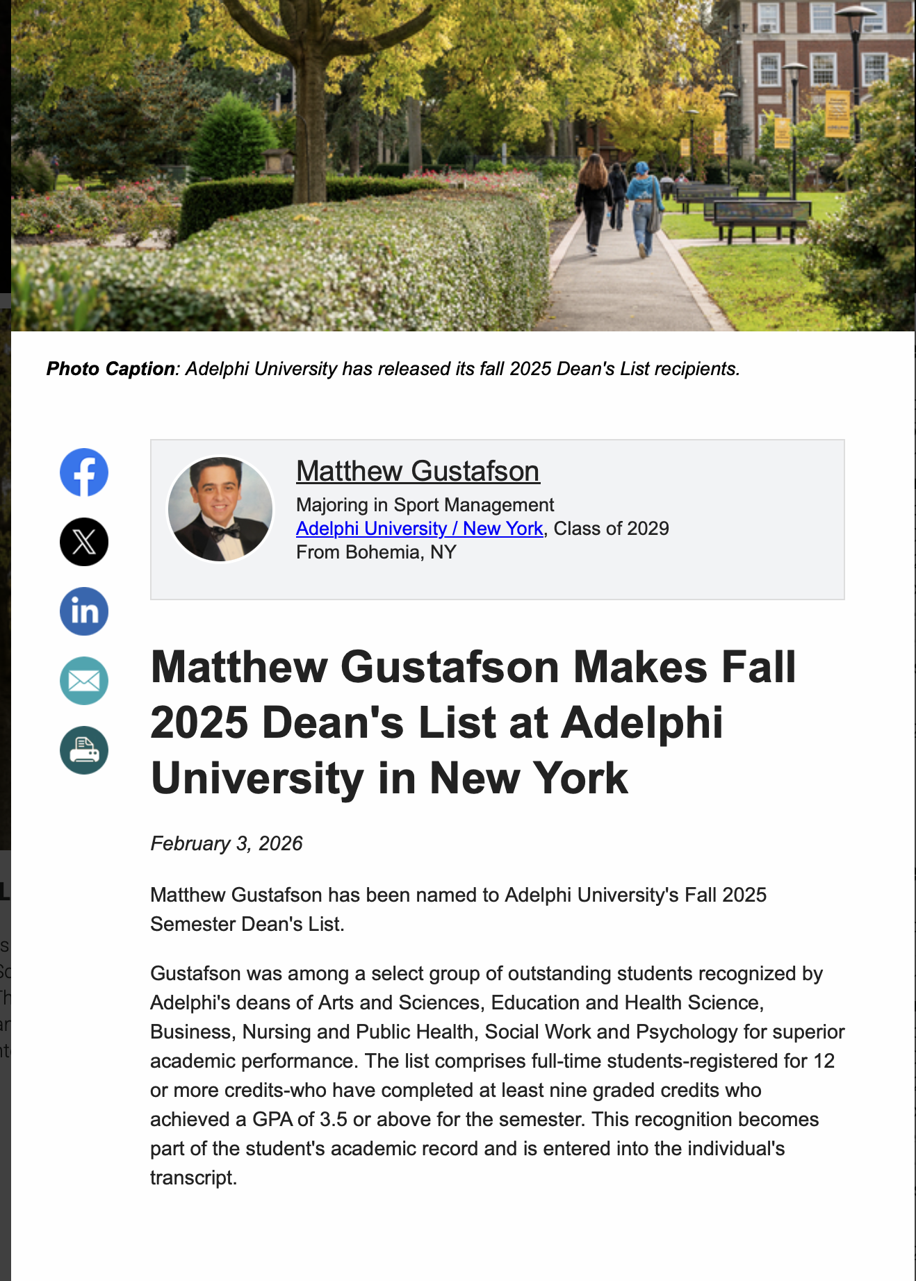 Matthew Gustafson Makes Fall 2025 Dean's List at Adelphi University in New York