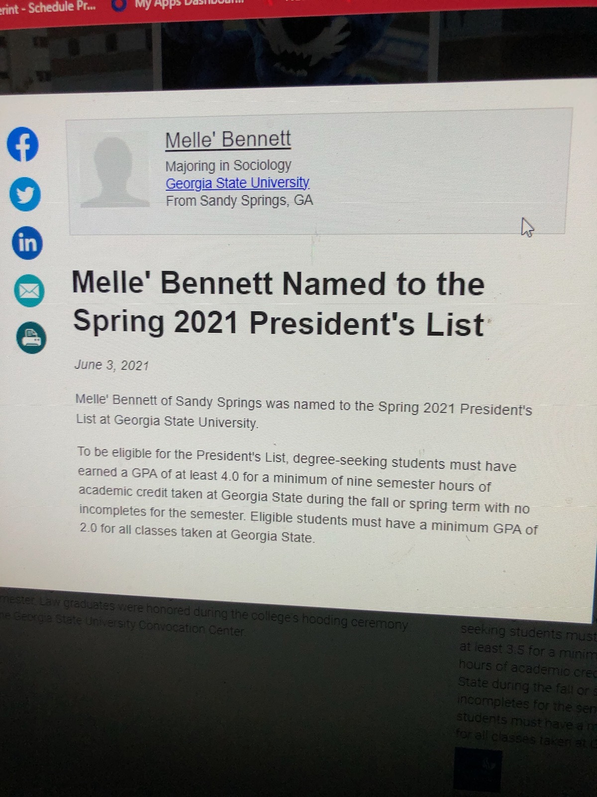 Melle' Bennett of Sandy Springs was named to the Spring 2021 President's List at Georgia State University. To be eligible for the President's List, degree-seeking students must have earned a GPA o...