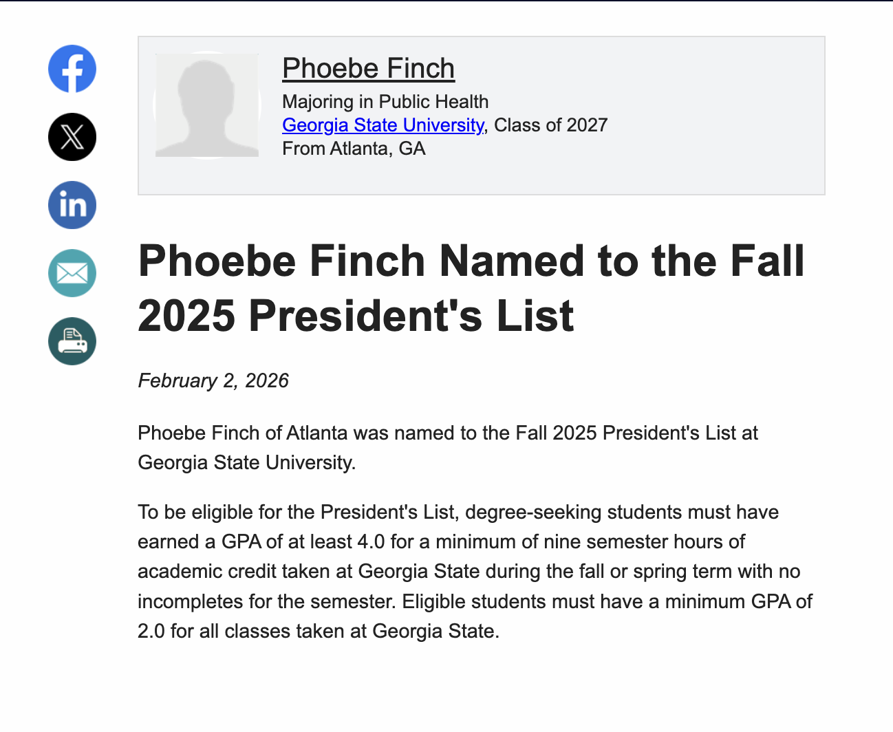 February, 03 2026 - Verified by Georgia State UniversityPhoebe Finch of Atlanta was named to the Spring 2025 Dean's List at Georgia State University. To be eligible for the Dean's List, degree-seeking students must have earned a GPA of at least 3.5 for...
