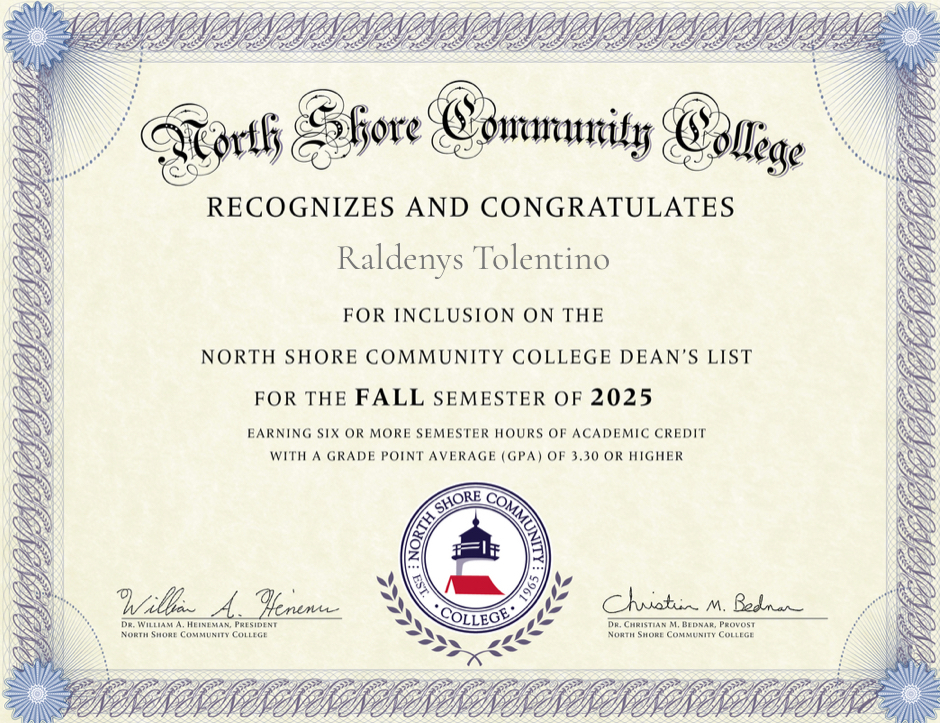 Raldenys Tolentino Named to Fall 2025 Dean's List at North Shore Community College