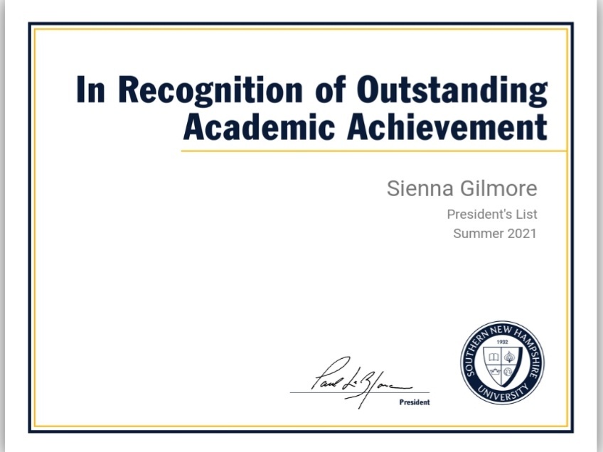 January, 13 2022 - Verified by Southern New Hampshire UniversitySienna Gilmore has been named to Southern New Hampshire University's summer 2021 President's List. Eligibility for the President's List requires that a student accumulate an academic grade point av...
