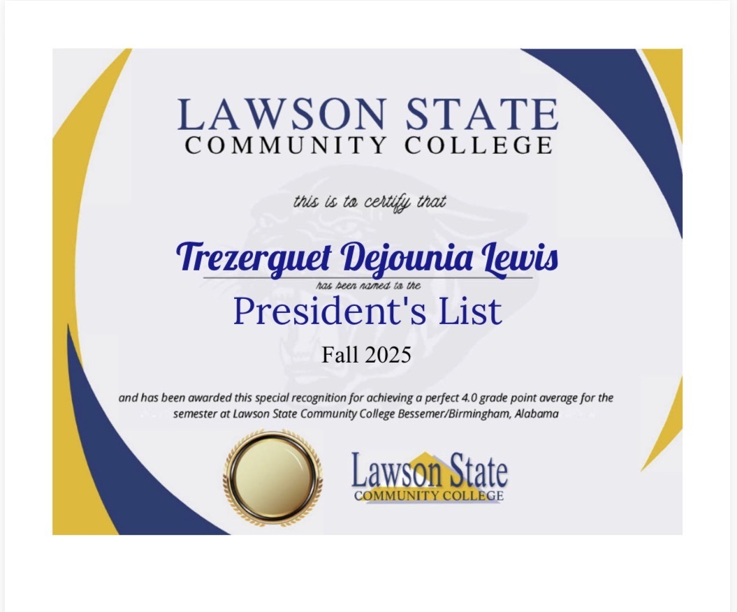 Trezerguet Lewis earns President's List Honor at Lawson State Community College!