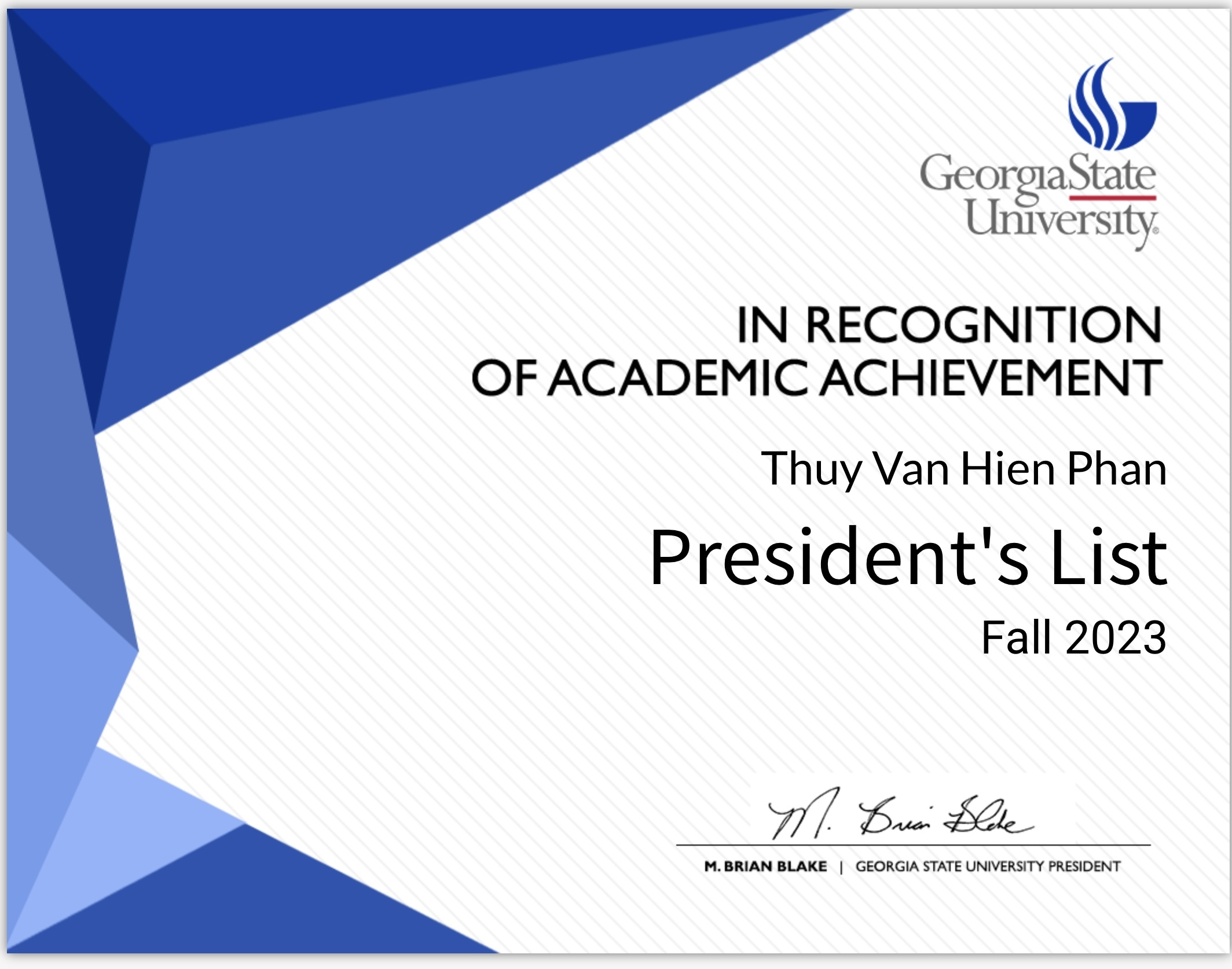 September, 13 2024 - Verified by Georgia State UniversityThuy Van Hien Phan of Mcdonough was named to the Spring 2024 President's List at Georgia State University. To be eligible for the President's List, degree-seeking students must have earned a GPA o...